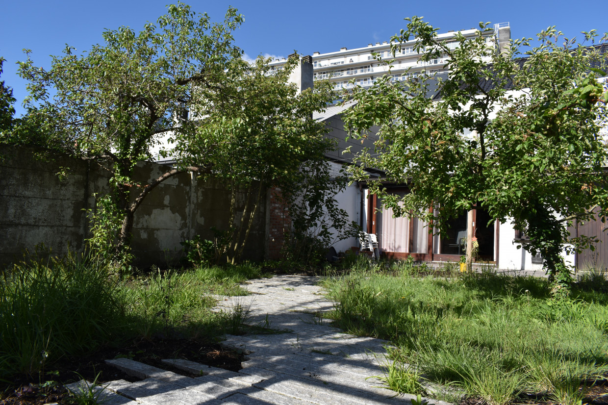 In het ontwerp nemen de bomen een cruciale plek in. Er wordt gekozen om de aanwezige spontane beplanting onder de bomen te behouden, en een extensief maaibeheer toe te passen. Plantzones met een aangepaste vegetatie sluiten hierop aan. Doorheen de tuin kronkelt een stenen pad richting het houten zonneterras met pergola. Deze grenst aan de wadi, die is ingetekend op de natste plaats in de tuin. De wadi wordt eveneens gevoed met hemelwater van het dak, waardoor een echte poel ontstaat.